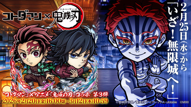 「コラボクエスト消費たいりょく0キャンペーン」でコラボコトダマンの満福を目指し、2月25日(水)から開催する『アニメ「鬼滅の刃」コラボ 第3弾 無限城編 第一章 猗窩座再来』に備えよう!