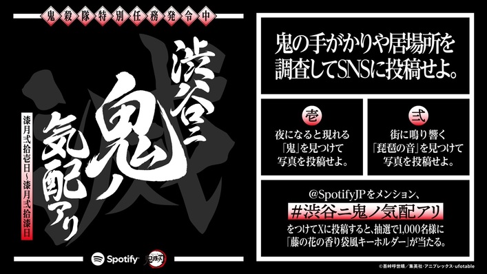 街中で鬼の姿を見つけ、ハッシュタグ「#渋谷ニ鬼ノ気配アリ」をつけてXに投稿いただいた方の中から抽選で、Spotifyオリジナル「藤の花の香り袋風キーホルダー」をプレゼント!